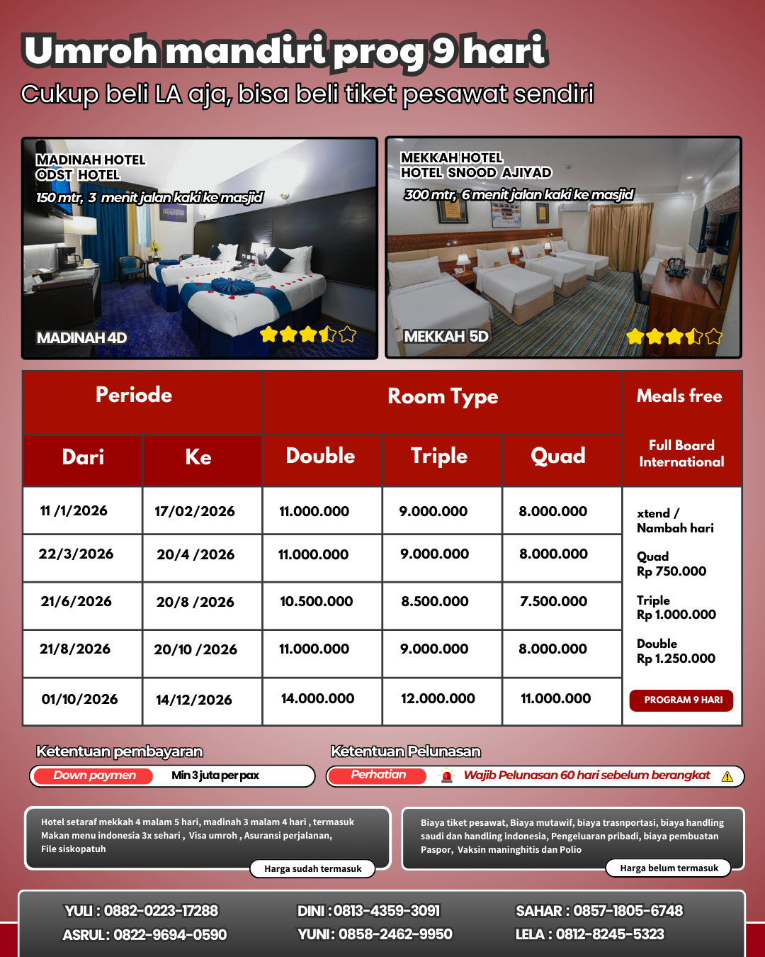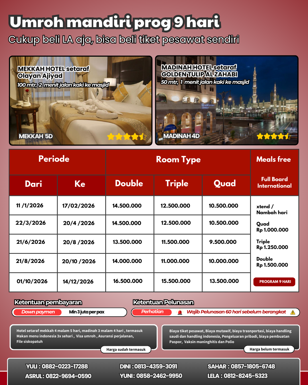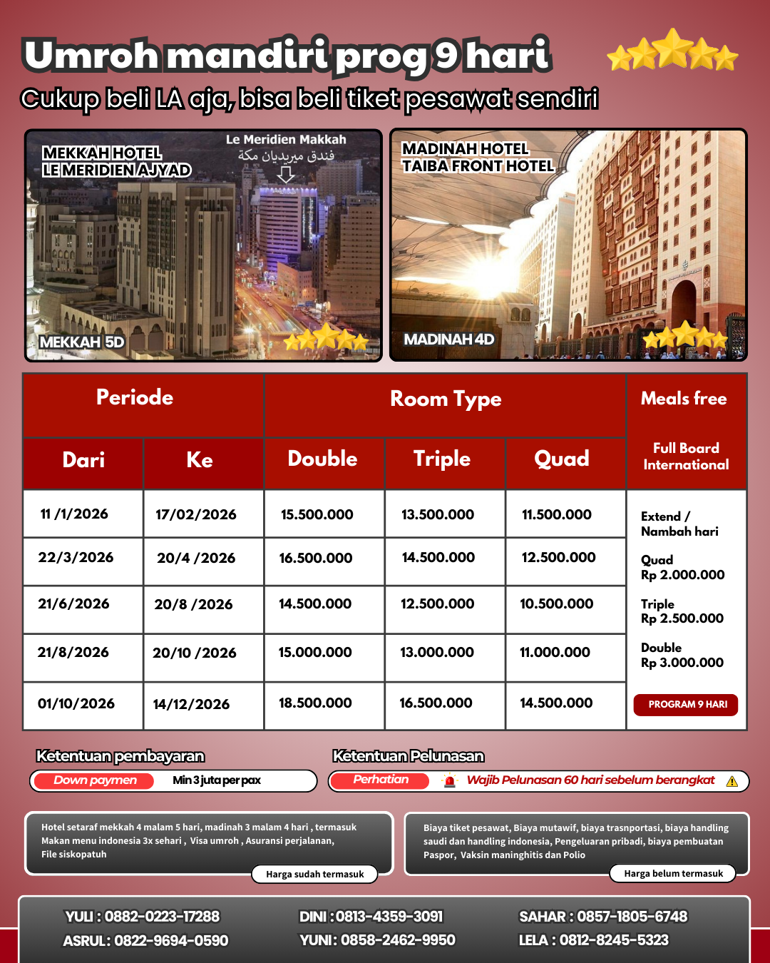 Kalau Ngak mau repot bisa pesan langsung LA Akomodasi aja - Jadi terima beres Udah termasuk hotel mekah dan madinag, makan 3x sehari, Visa umroh, Asuransi perjalanan, dan siskopatuh