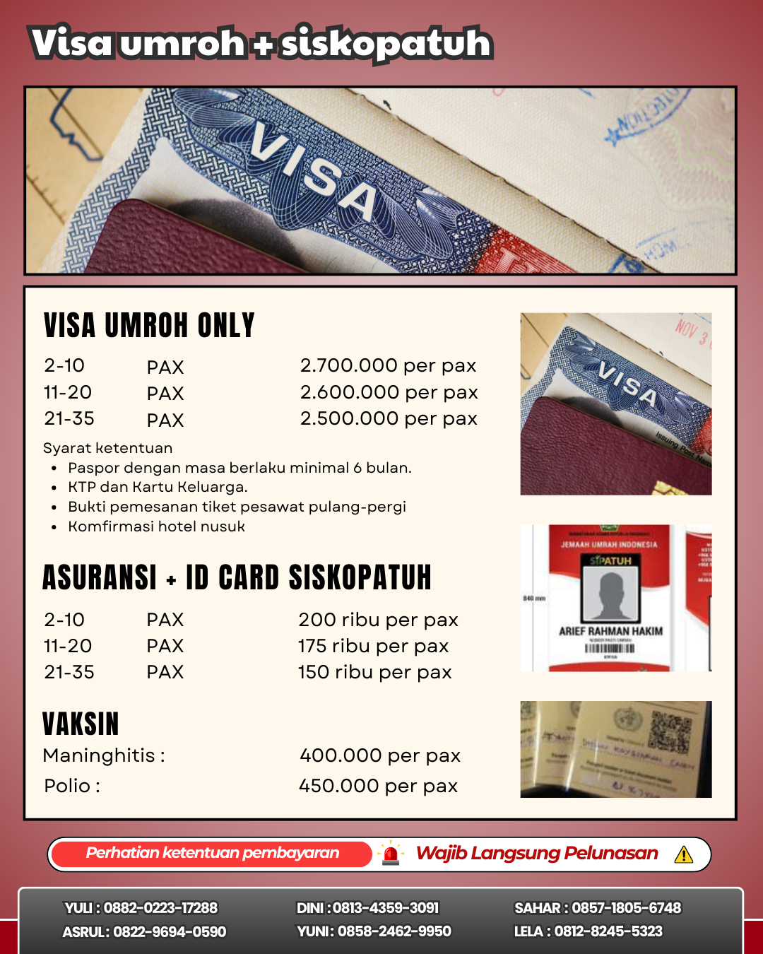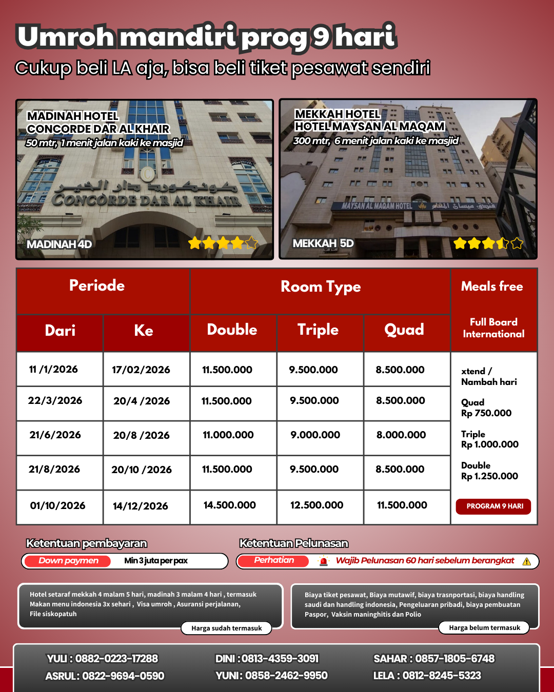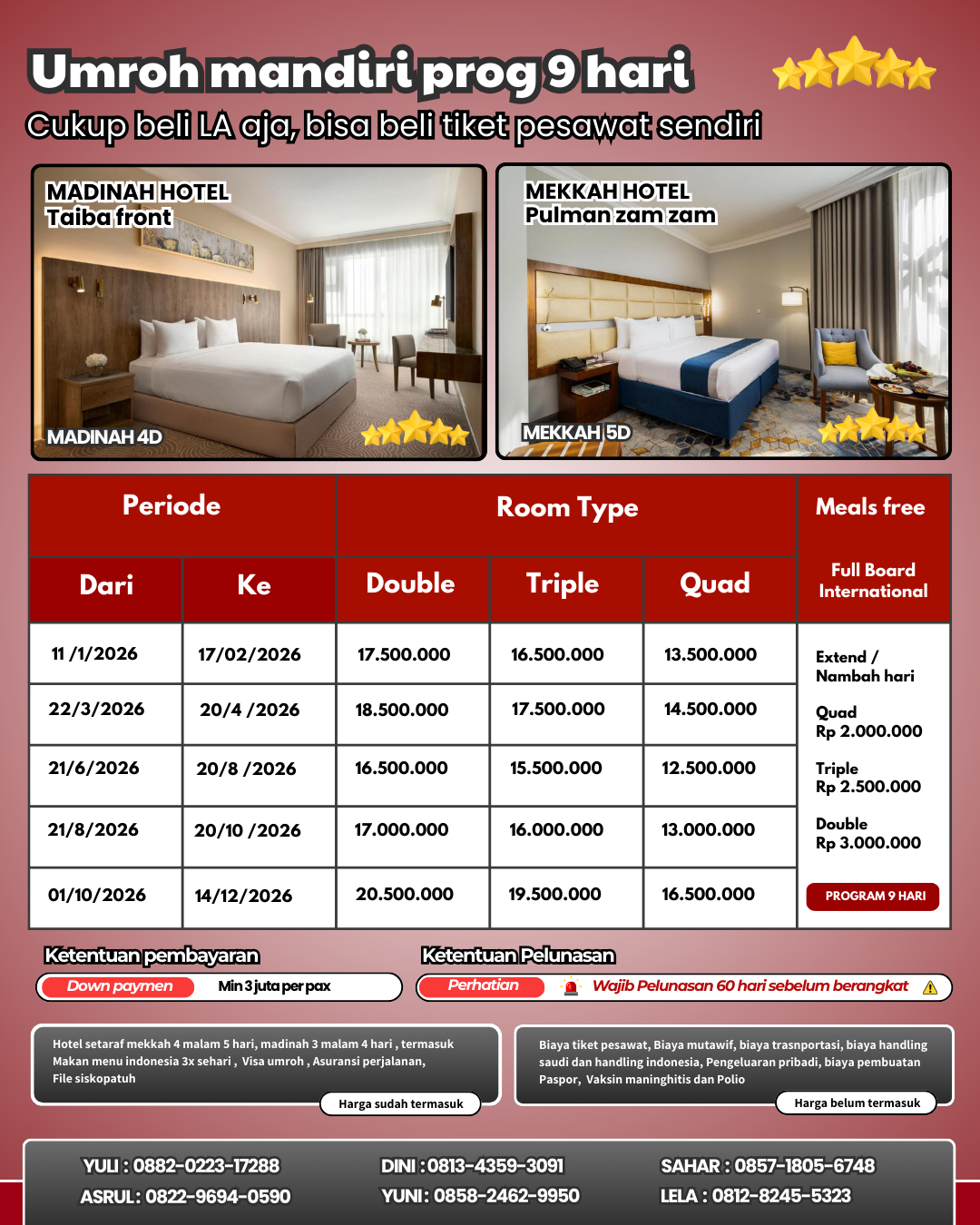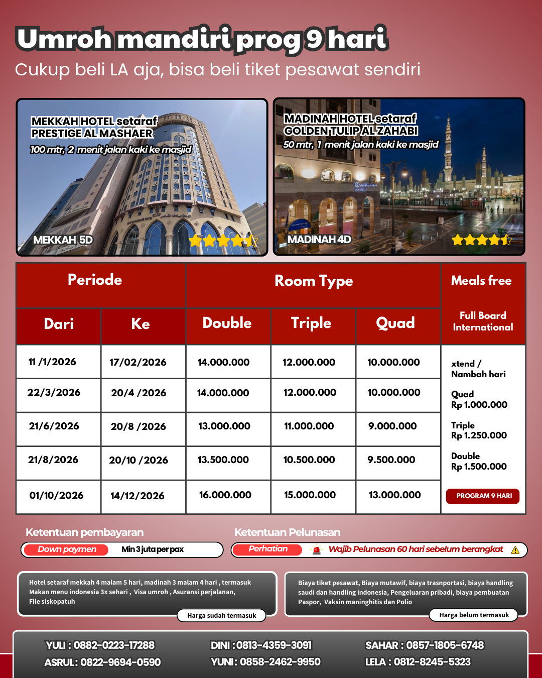 Kalau Ngak mau repot bisa pesan langsung LA Akomodasi aja - Jadi terima beres Udah termasuk hotel mekah dan madinag, makan 3x sehari, Visa umroh, Asuransi perjalanan, dan siskopatuh