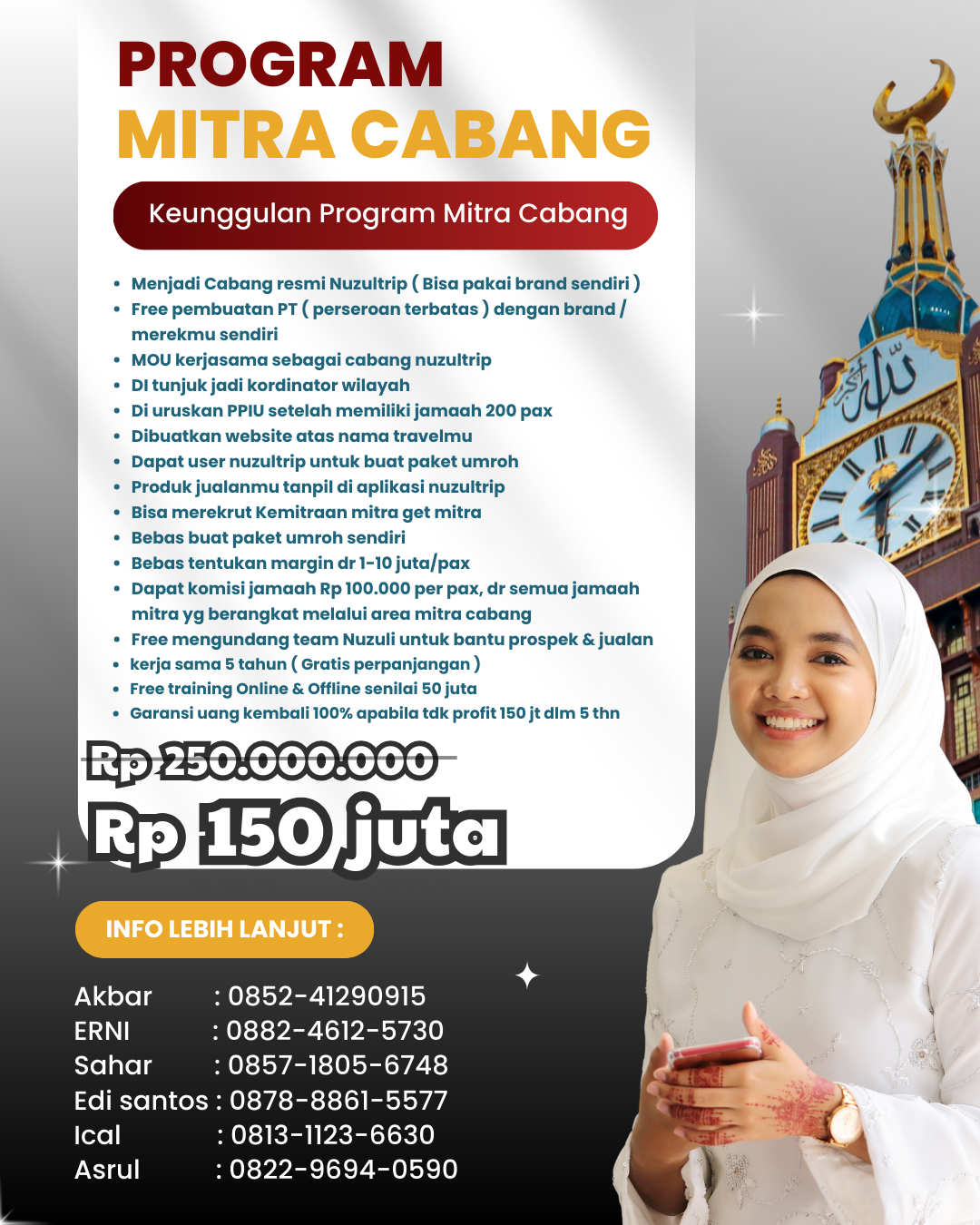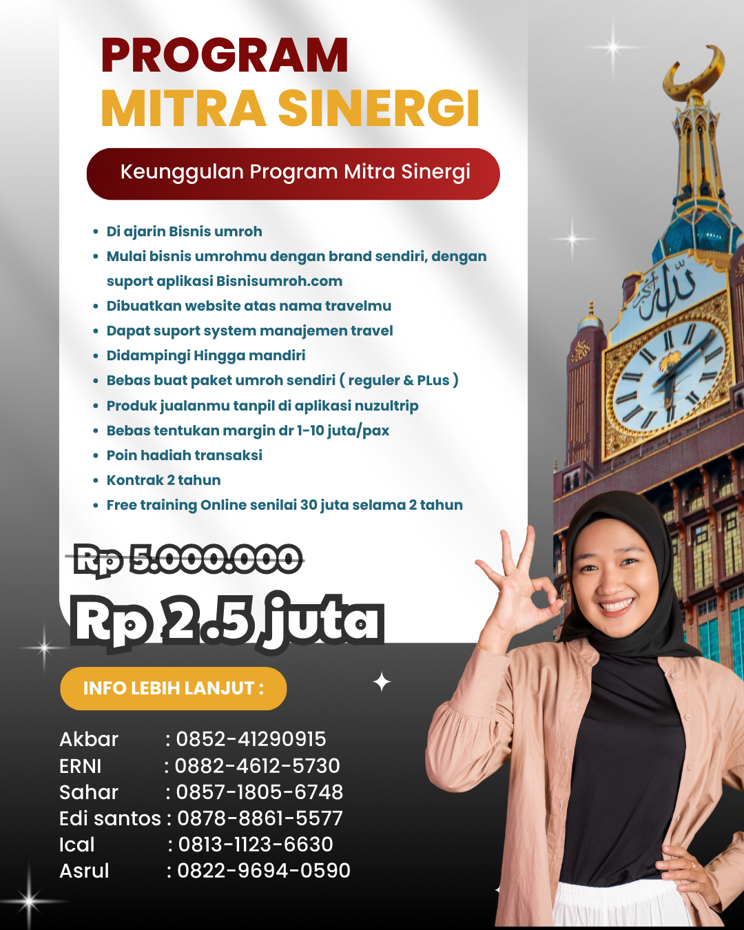 Dengan biaya kemitraan mulai dari 2.5 juta rupiah, Anda sudah bisa Jadi OWNER di travel umrohmu sendiri bersama Nuzuli — tanpa ribet urus izin dari nol